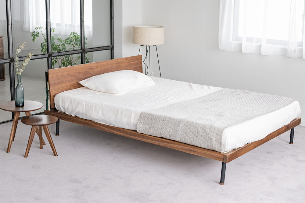 木製ベッドフレームを構造から見直し、荷重のかかるサイドフレームは見えないところにスチールを使用して、シンプルで、すっきりシャープなシルエットながら高い強度を実現しました!