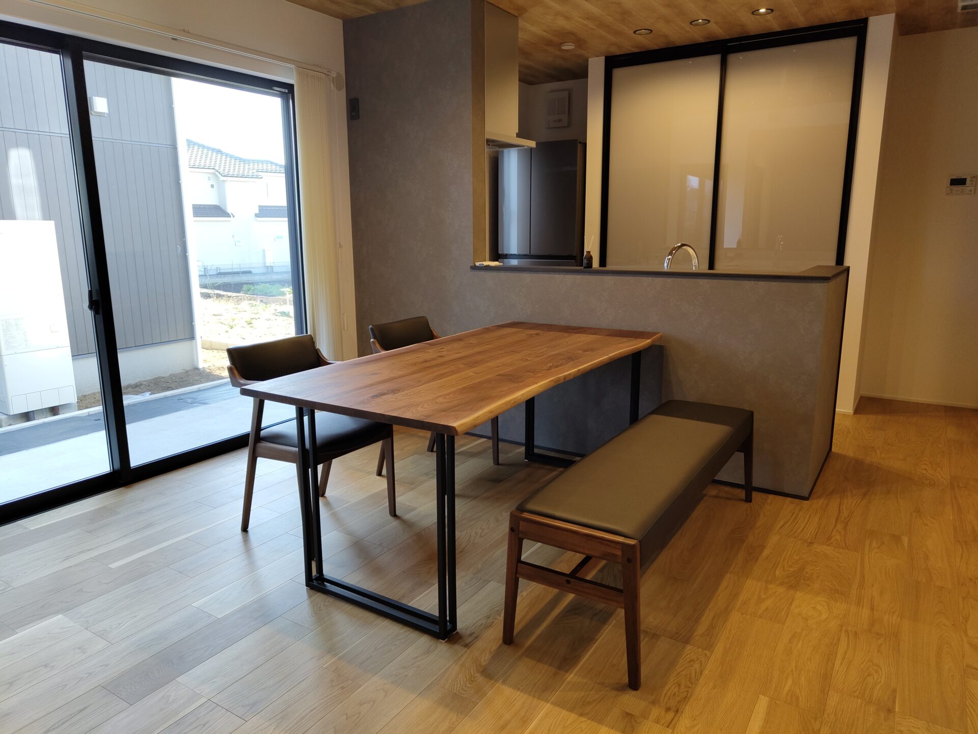 ダイニングテーブルは高級材ウォールナットを使い、長手エッジには意図的に白太の入った天然の耳付き材を配置するという、ひと手間もふた手間もかかった世界でたった一つの形をお届けしました。