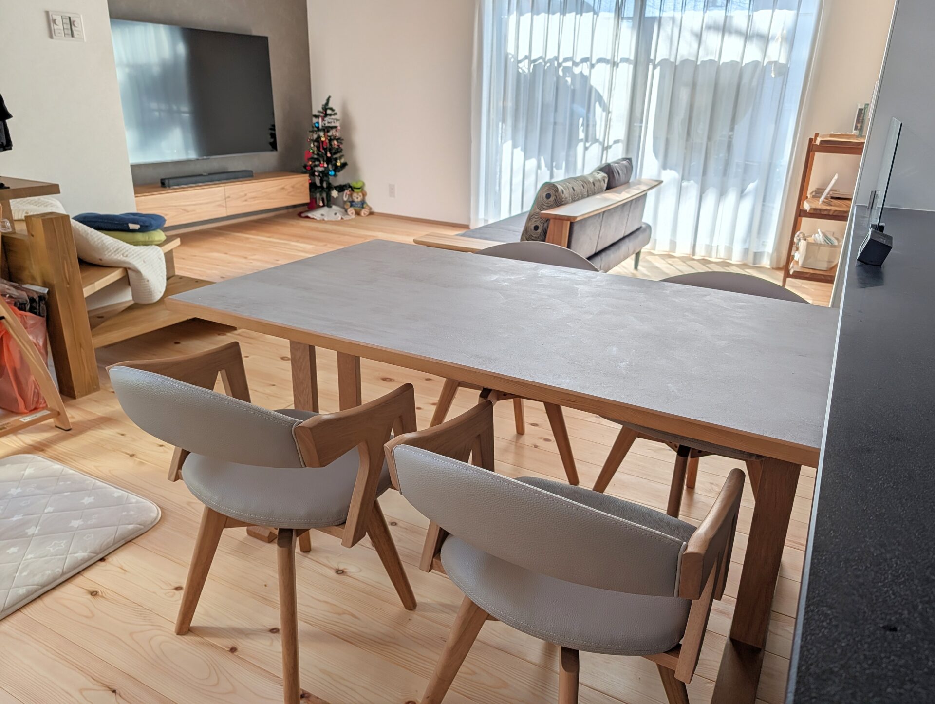 キッチンはグレー基調のモダンな内装ですので、無垢材とメラミン材の異素材を組み合わせたダイニングセットでまとめております。