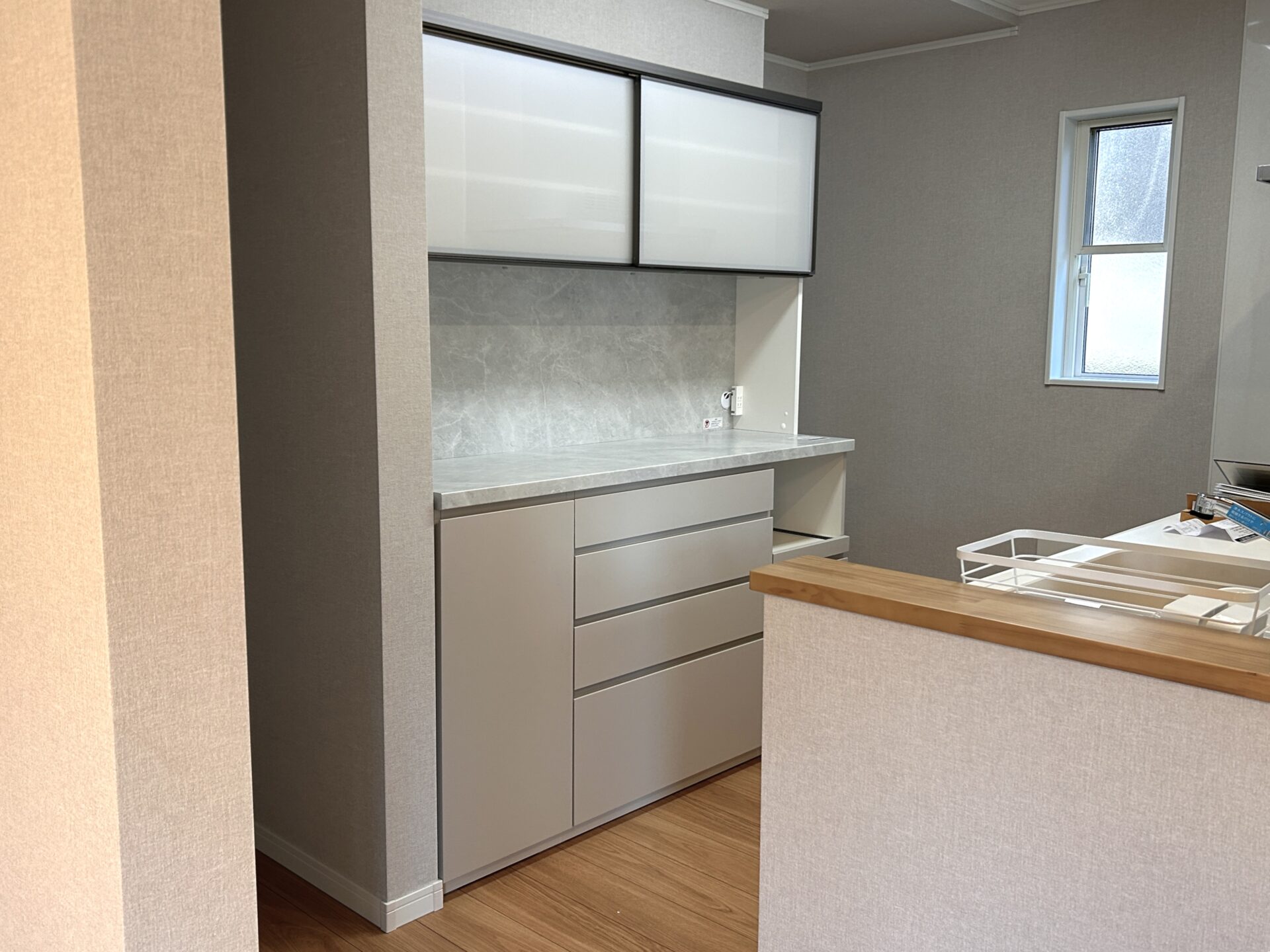 ダイニングボードは、引出しの取っ手などによく使われる金属部品を廃し、極力細くした引戸の戸枠はマットなグレー色に、そしてカウンター部から続く背板に同一色のメラミン材を使うなど、随所に洗練されたスマートなデザインが光る商品です。