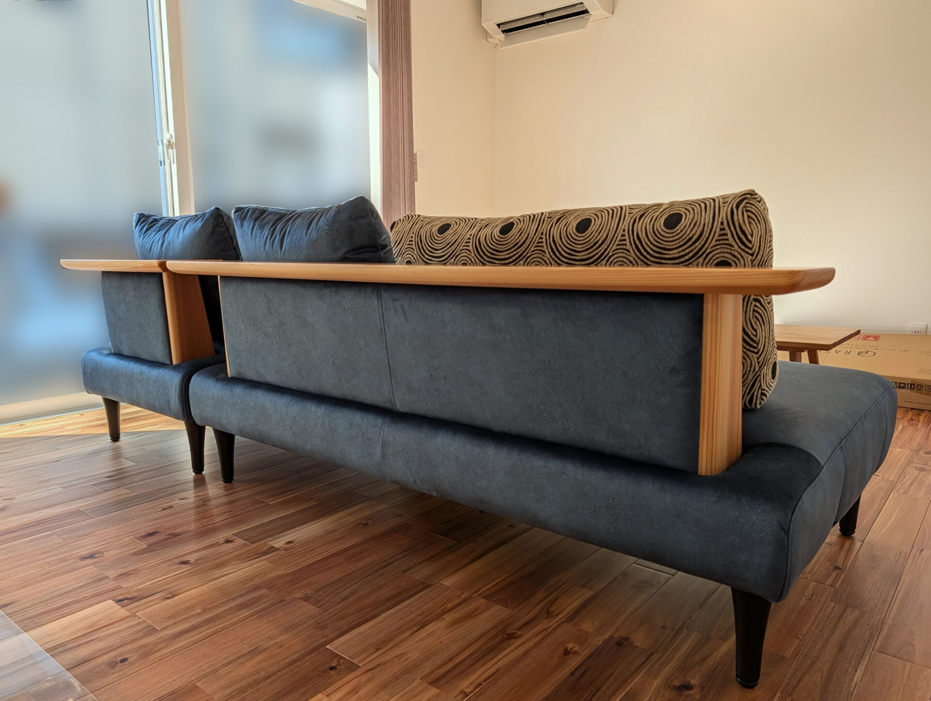 杉の無垢材を背部に大胆に使った和モダンなソファに、クッションを一つだけ柄の生地に変えてアクセントになりました!