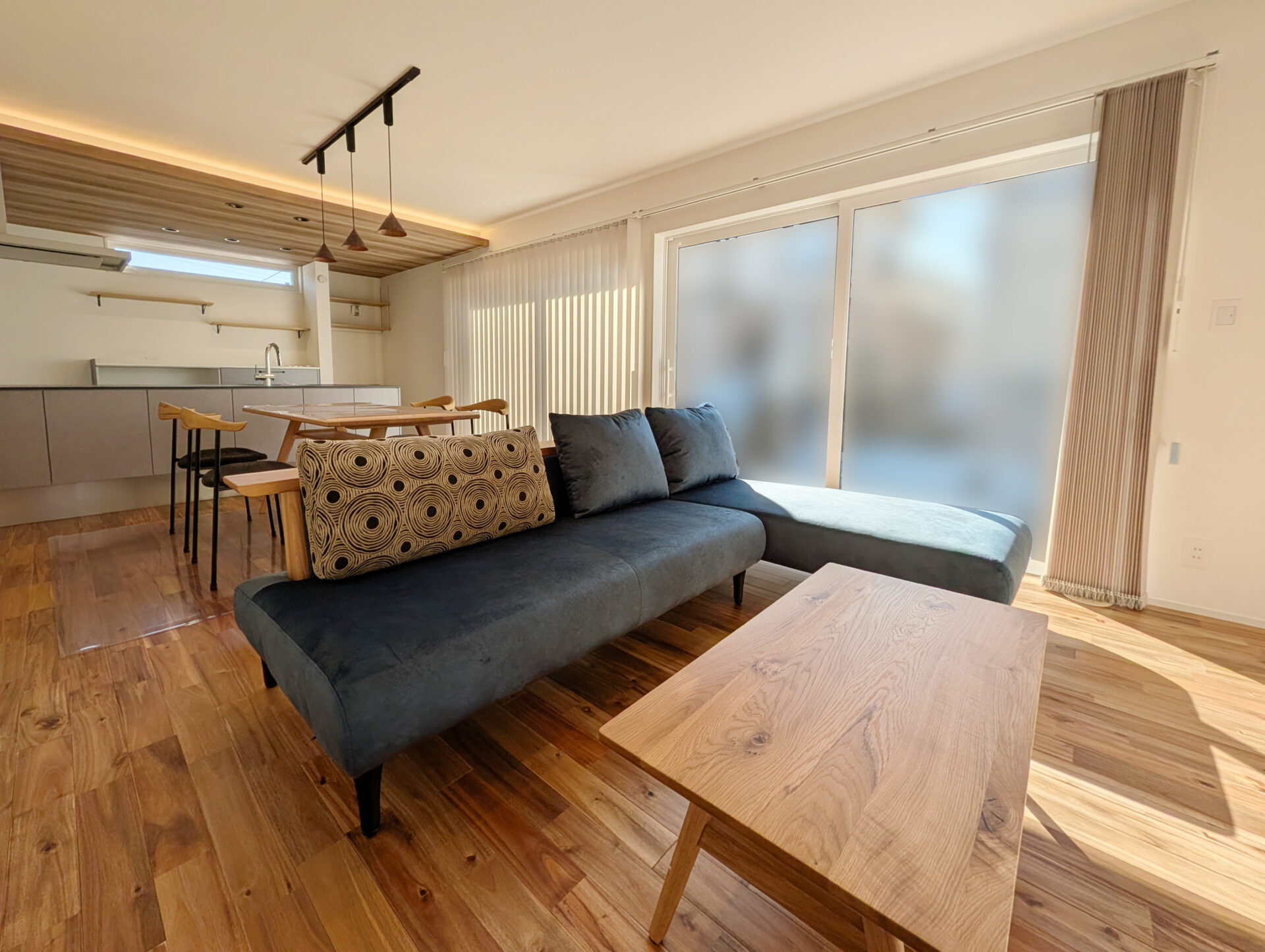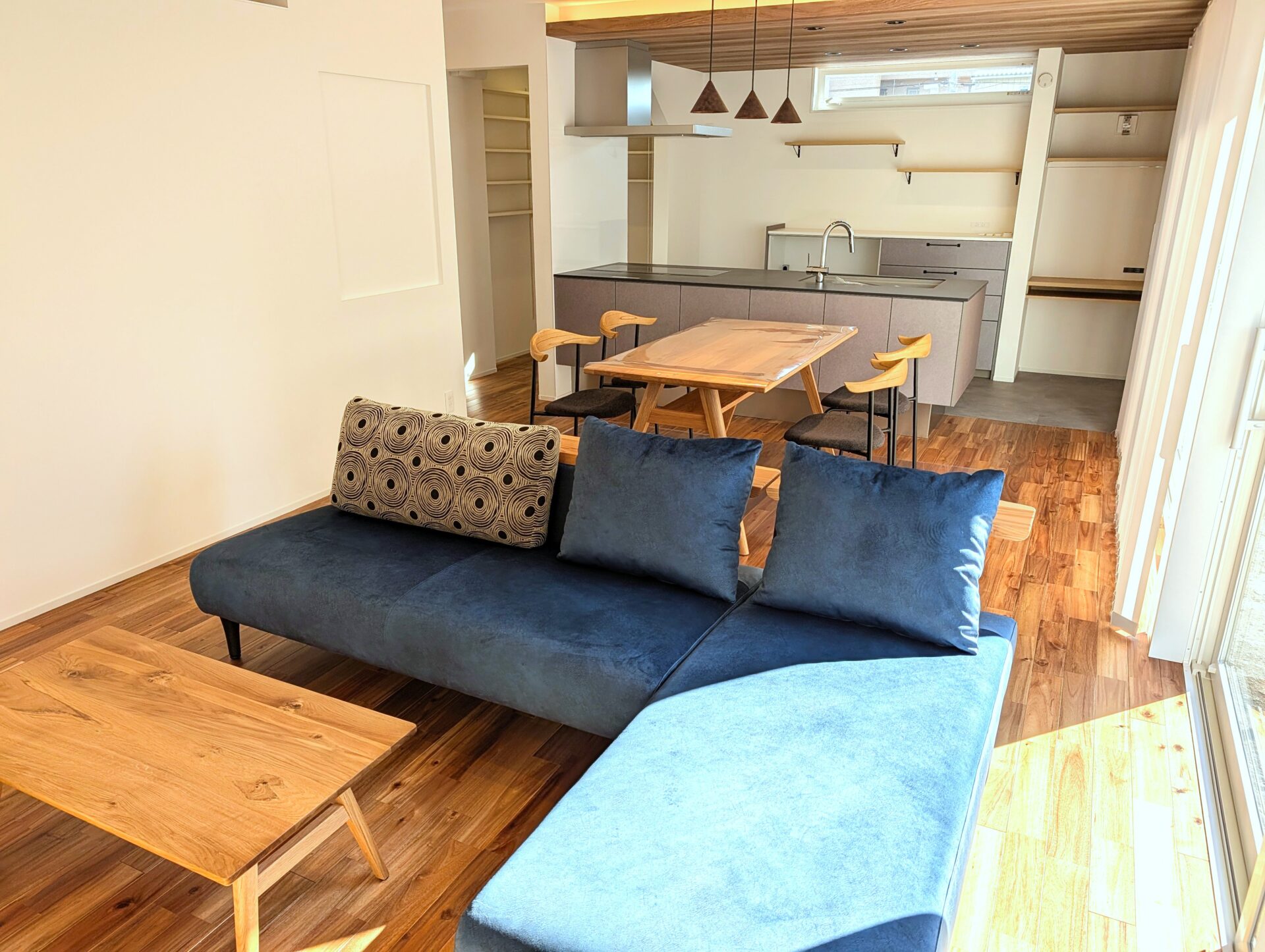 キッチンからダイニング、ソファが一直線に並んだ間取りのため、視線の妨げにならないよう、ソファはローバックのものを。