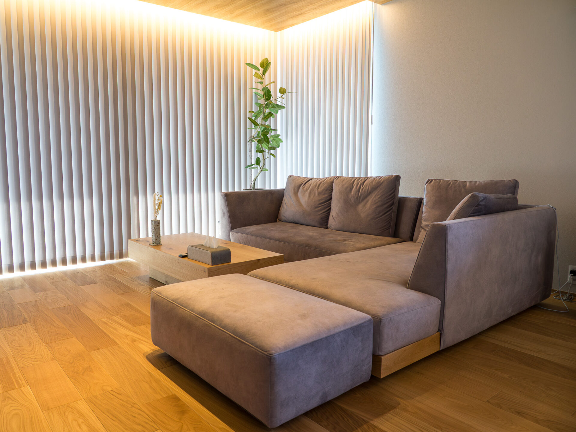 ゆったりと座れるグレーのローカウチソファは、片側をオープンタイプ+オットマンにしたことで横から見てもすっきりとした印象に。