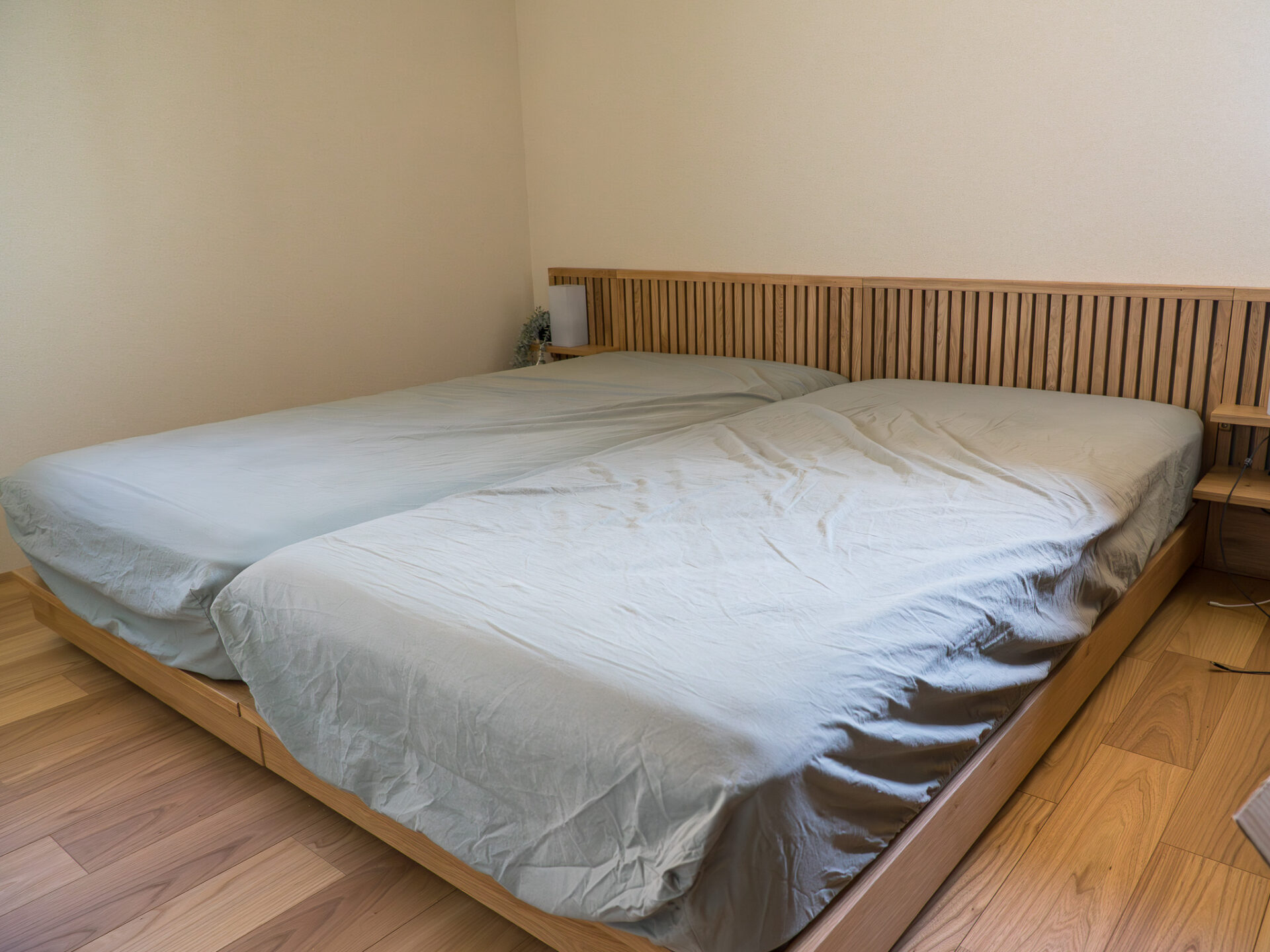 縦格子が美しいベッドフレームは、カジュアルすぎず、上品でナチュラルモダンな雰囲気です。