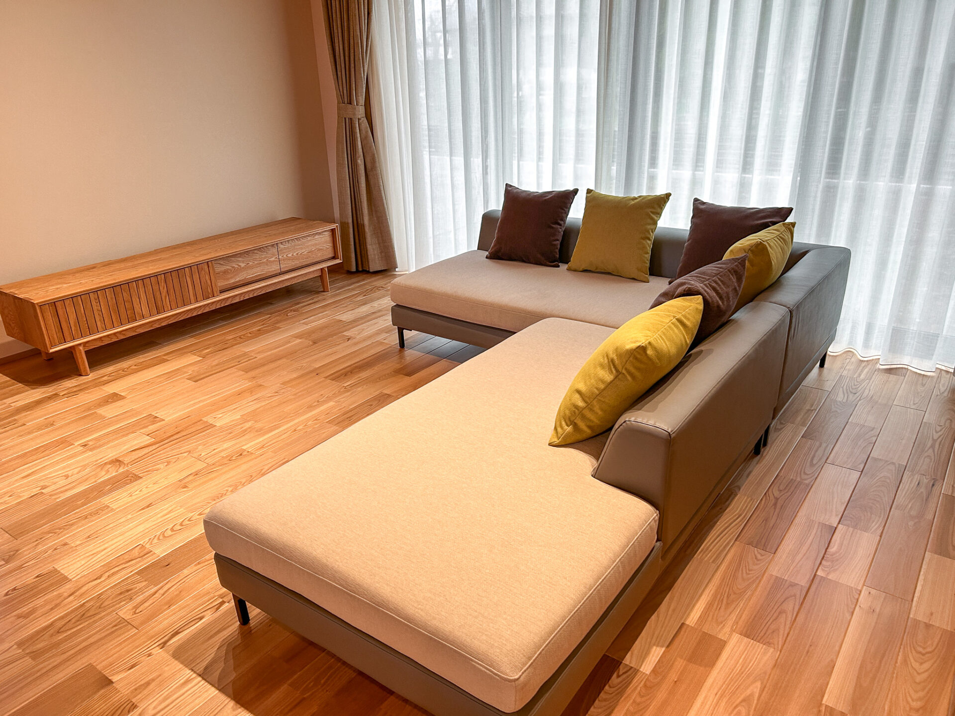 TVボードは、日本的なデザインと北欧的なデザインを融合した落ち着きのあるデザイン。