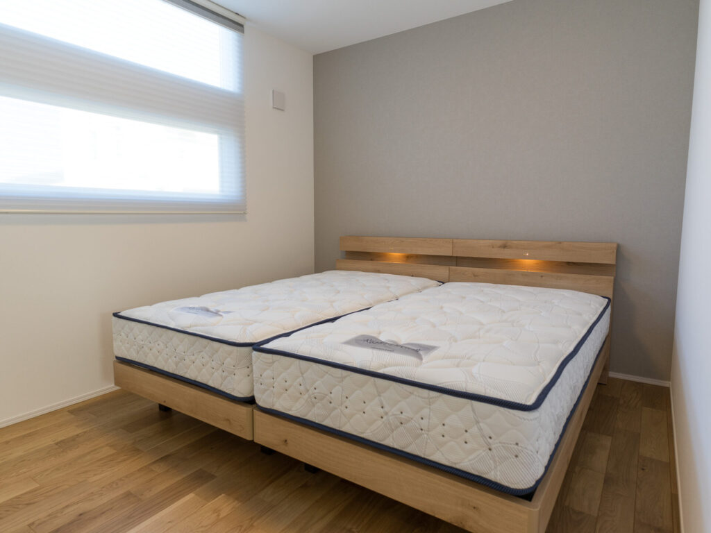 ベッドルームには国産フレームと国産ポケットコイルマットレスを納品しました。