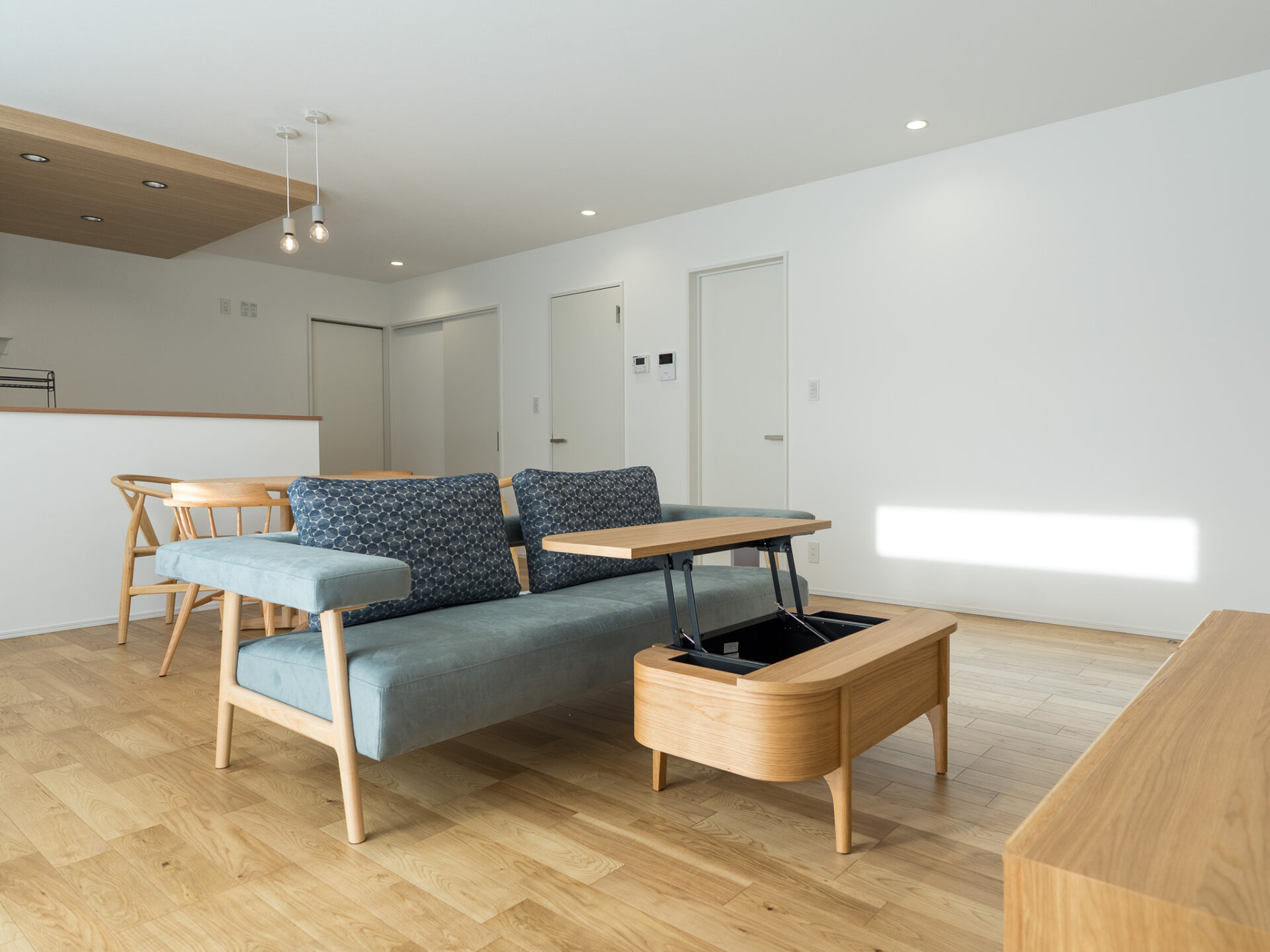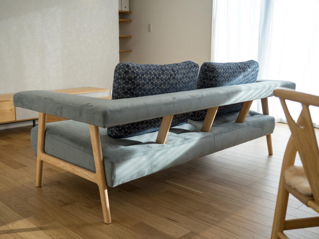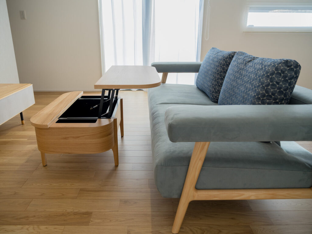 リビングスペースには、肘掛けが浮いているようなデザインの木フレームソファとリフトアップテーブル。