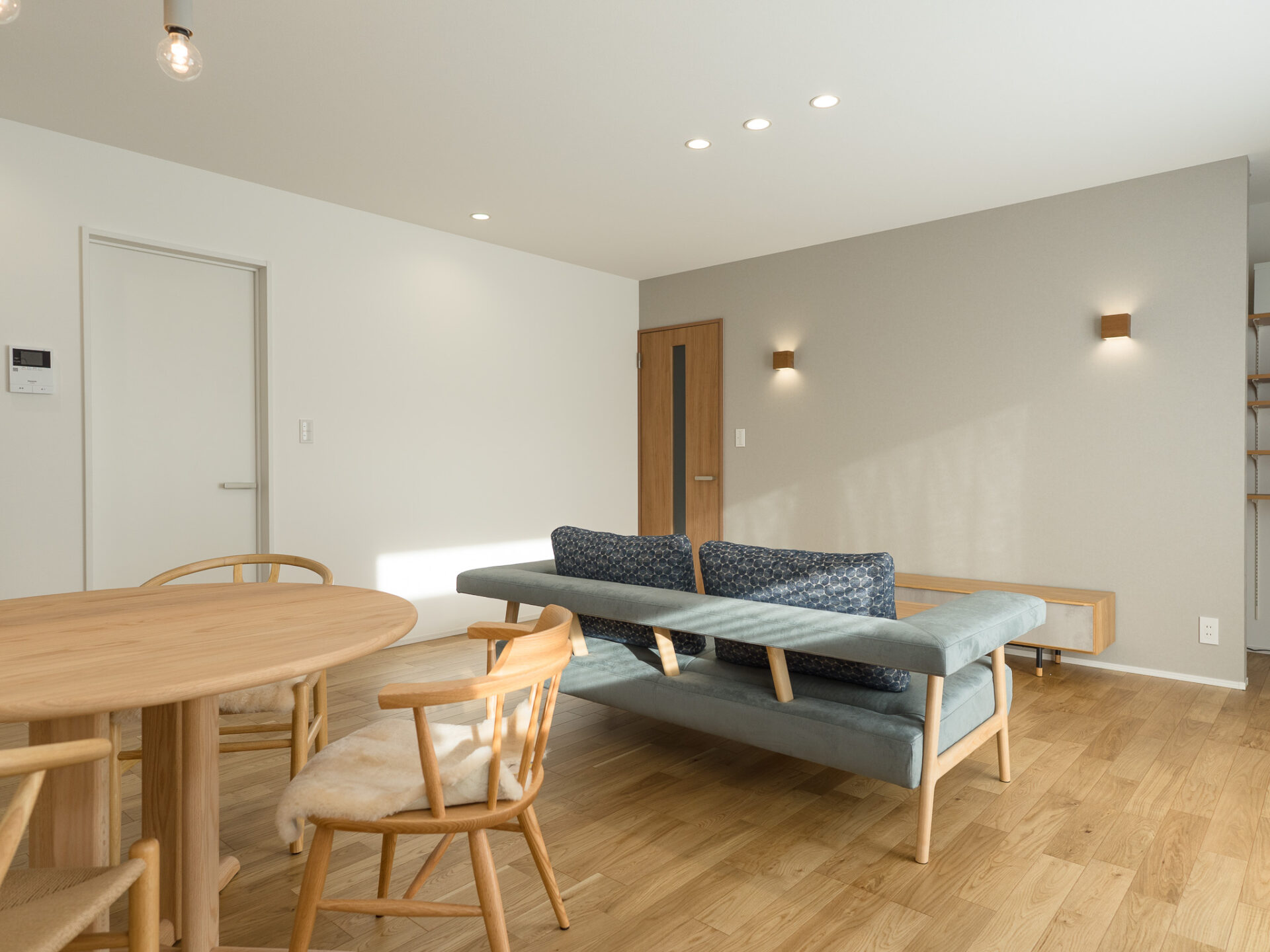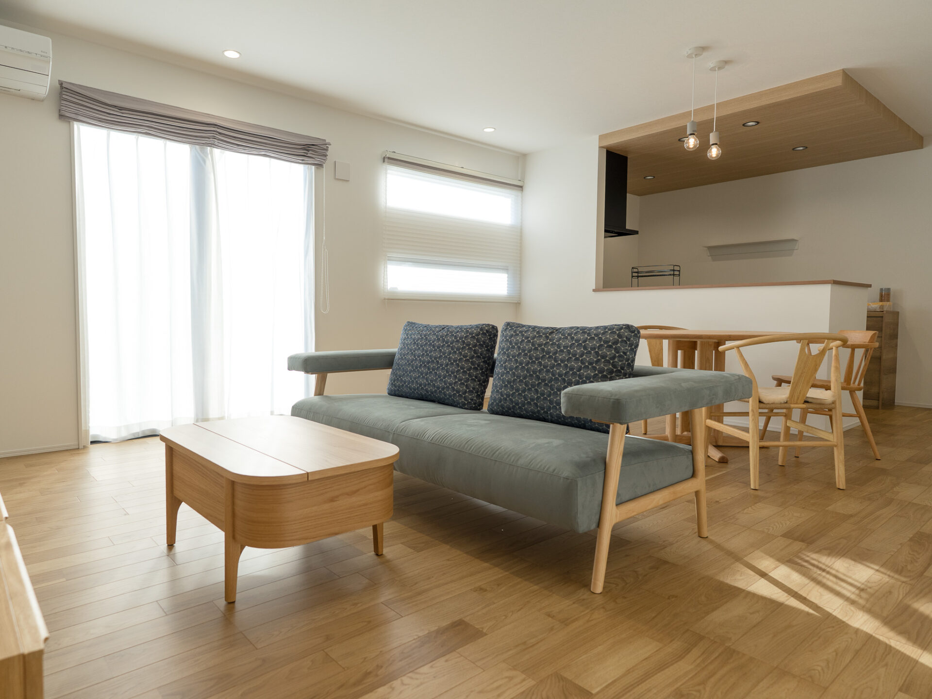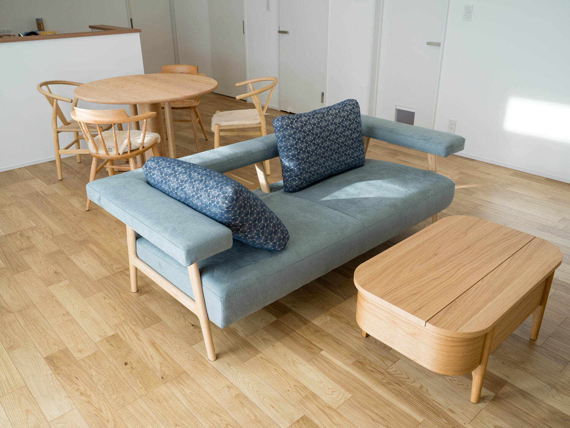 リビングスペースには、肘掛けが浮いているようなデザインの木フレームソファとリフトアップテーブル。