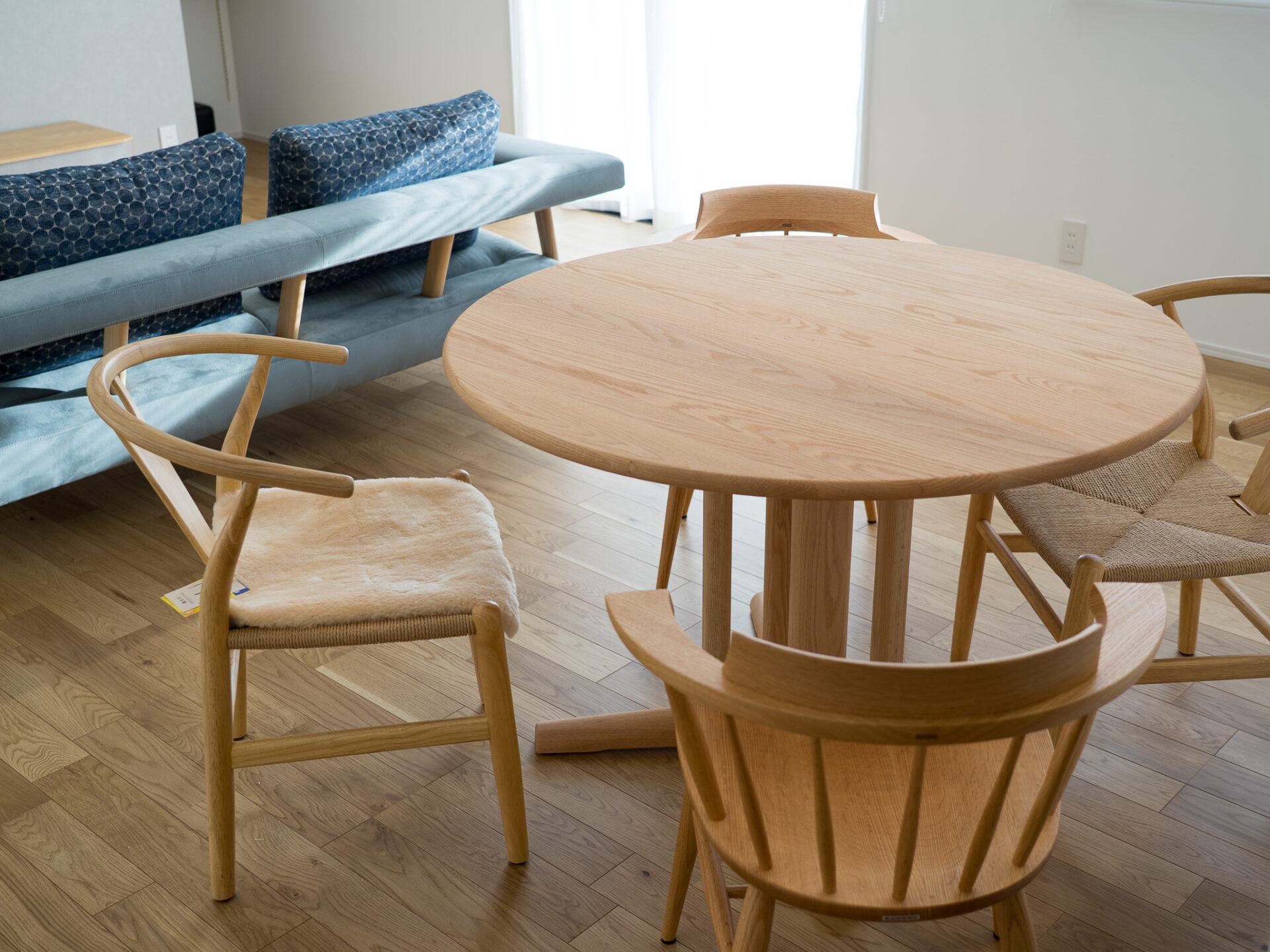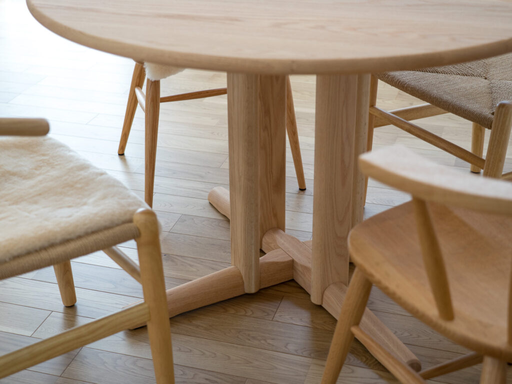 テーブルは円形が良いとのご要望でしたので、脚の形と天板のサイズを吟味して、国産オーク材のテーブルをお選びいただきました。